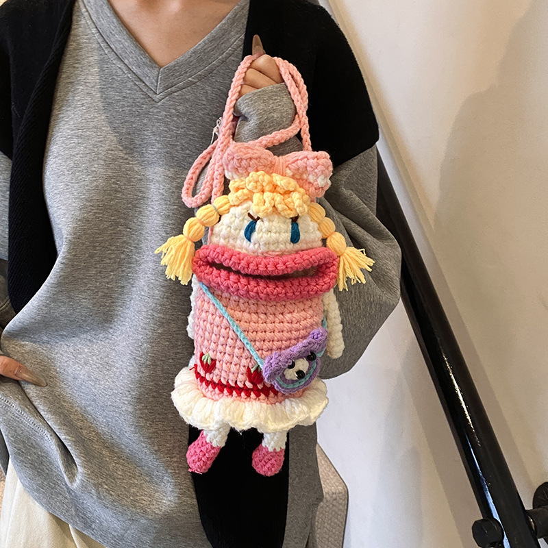 Bold, cute, and full of personality — this **handmade crossbody bag** features a playful “sausage-lips girl” design that’s sure to turn heads and spark smiles. With her exaggerated pout, rosy cheeks, and soft pink palette, this crocheted character brings humor and sweetness into one unique fashion accessory. Whether you're heading to a café, festival, or just want to add fun to your outfit, this bag is the perfect statement piece.